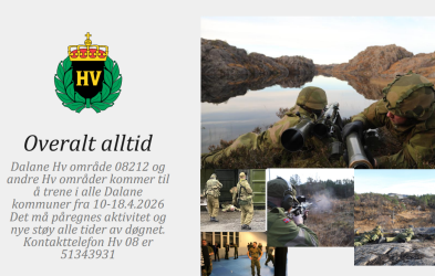 Dalane Hv område skal som en del av den nasjonale beredskapen trene i perioden 10.4.2026-18.4.2026.