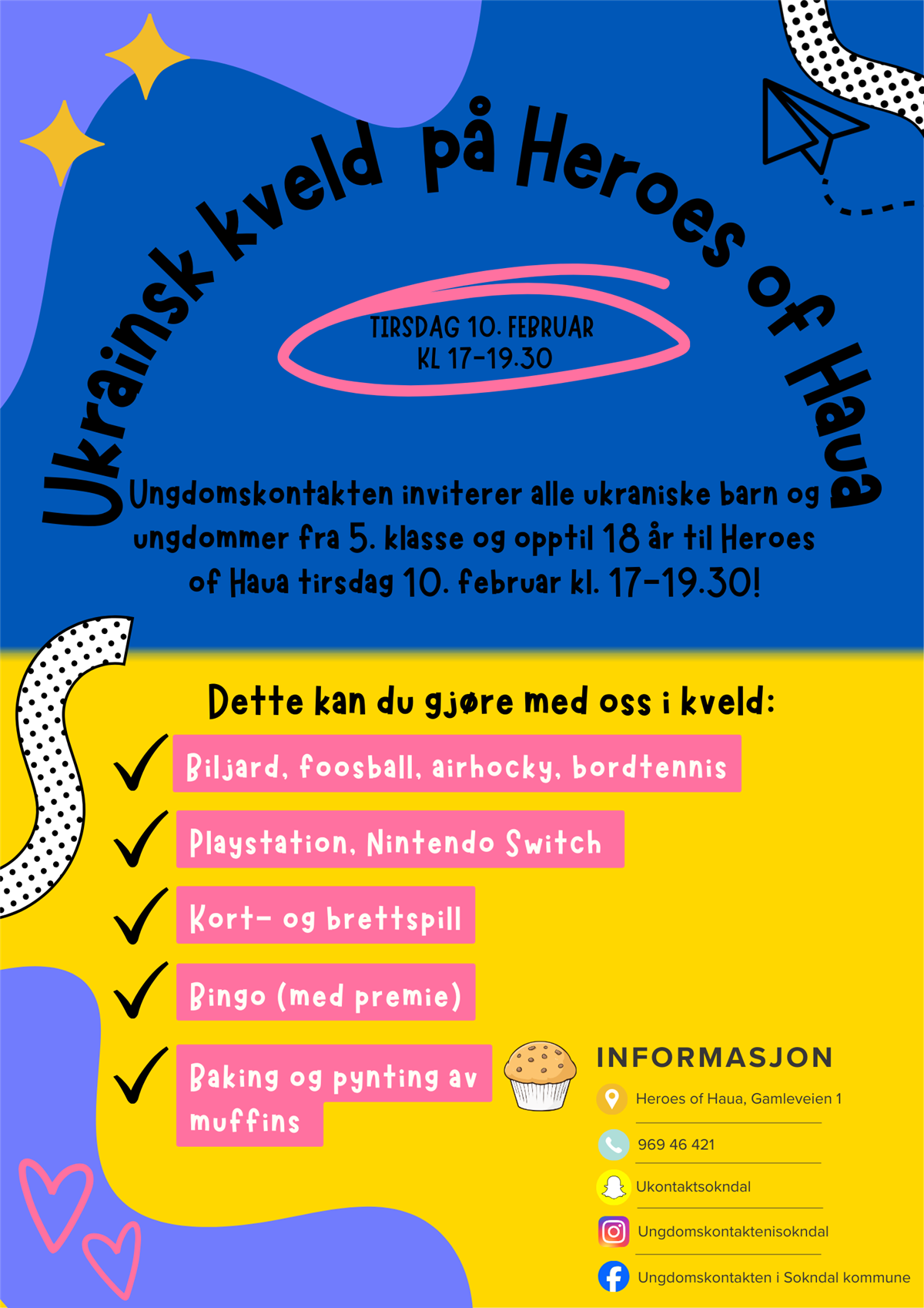Ungdomskontakten inviterer alle ukrainske barn og ungdommer fra 5.klasse og opptil 18 år til en aktivitetskveld.