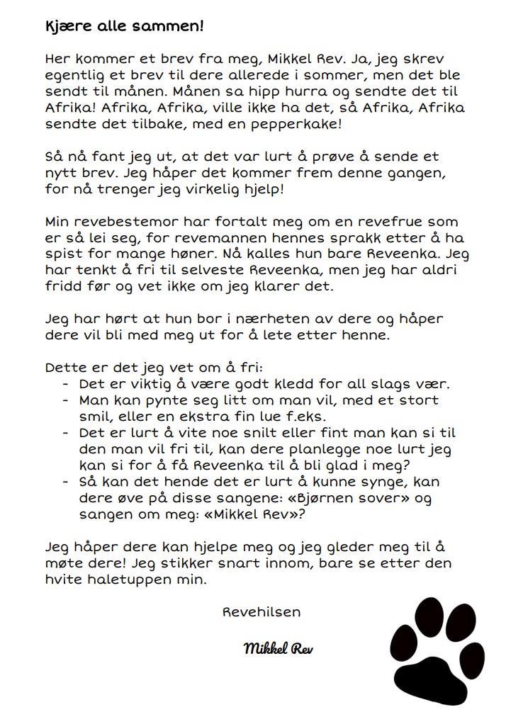 I forestillingen «Reveenka» møter vi selveste Mikkel Rev, som endelig har tenkt å fri til den stakkars Reveenka. Men Mikkel har aldri fridd før, og han vet heller ikke særlig mye om hva som er lurt å gjøre hvis du vil at noen skal bli glad i deg. Kanskje noen kan hjelpe ham?