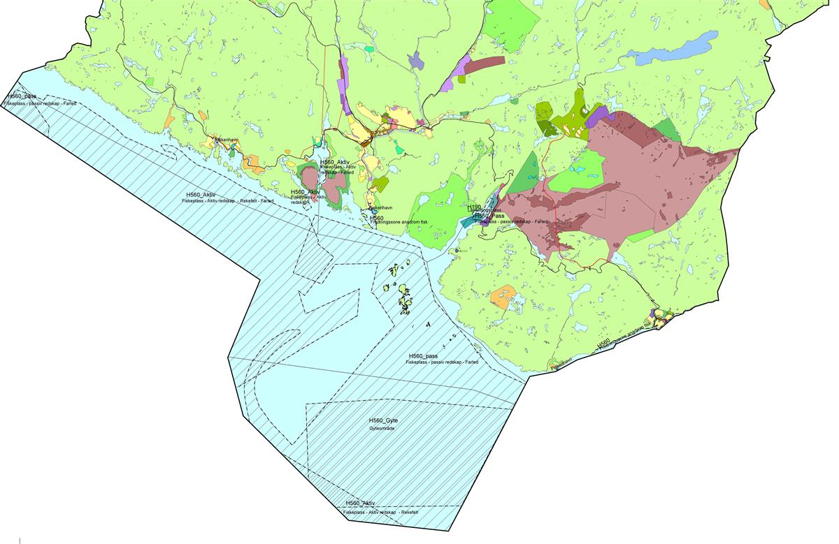 e) Områder der farled og fiskeplasser/gyteområder overlapper hverandre er vist som «hensynssone H560 med påskrift fiskeplass/farled/gyteområder».