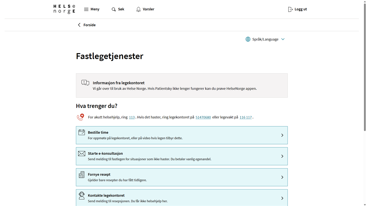 Legekontoret tar i bruk fastlegetjenester på HelsenorgeSokndal legekontor tar i disse dager i bruk fastlegetjenester på helsenorge.no. Dette i tråd med ny forskrift som trer i kraft 1. januar 2026. Innlogget på helsenorge.no kan du bestille time, fornye dine resepter, og starte e-konsultasjon (du betaler vanlig egenandel) hos din fastlege.Man kan også sende melding til legekontoret for andre henvendelser, som ikke er for helsehjelp.Kommunikasjonen er sikker, og havner direkte inn i legekontorets journalsystem.Les mer om legekontoret på deres informasjonsside her.Skjermbilde: Helsenorge.no