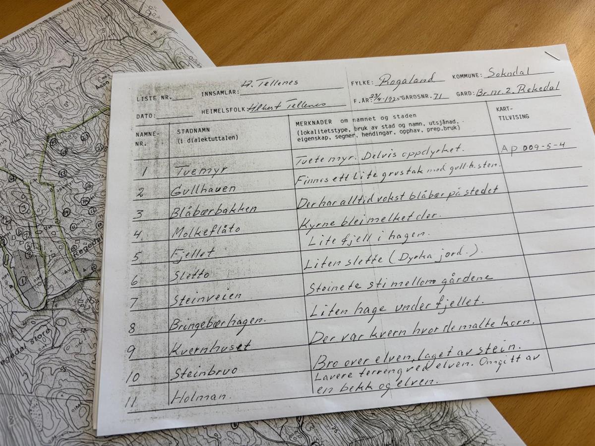 I 1986 inviterte kommunen til møte på Soknatun hvor flere fikk utdelt kart og skjema for å kunne registrere lokale stedsnavn i kommunen. Det er fortsatt flere skjema som ikke er levert inn. Dersom du har dette liggende, ønsker nå kommunen å få disse innlevert. De kan leveres på Servicekontoret på Soknatun eller til historielaget. Ta gjerne med til verkstedet 29. april.