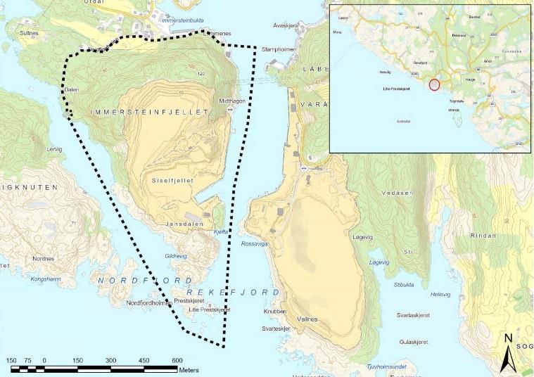 dekar og omfatter eksisterende steinbrudd samt del av Immersteinfjellet (Rekefjord vest), og grøntareal nord for